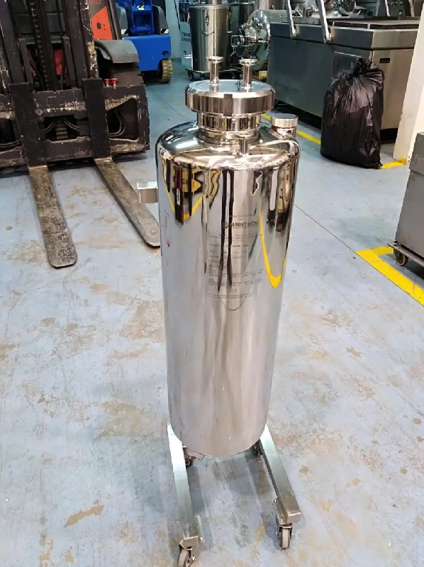 Réservoir en acier inoxydable d'une capacité de 26 litres. Finition intérieure polie miroir. Fond supérieur avec trou d'homme de diamètre intérieur 80 mm, soupape de sécurité et collier de serrage intérieur de diamètre 10 mm. Décharge de type pince sur le fond inférieur Mesures générales : Hauteur du corps : 600 mm Diamètre du corps : 200 mm Hauteur totale : 1100 mm