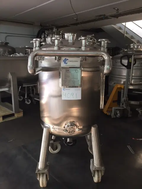 Cuve en acier inoxydable 316L d'une capacité de 200 litres. Fabriqué par Sapphire Engieering en 2000. Finition intérieure polie miroir. Fond supérieur avec judas et 7 buses à pince. Décharge de type pince sur le fond inférieur avec clapet à siège. Une sortie latérale de type pince et un judas. Sur 4 roues pour un déplacement facile. Agitation magnétique à hélice avec moteur électrique de 0,25 kW à 2720 tr/min. Caractéristiques techniques du corps : Pression de conception : 3 bar / vide Pression d'essai : 4,73 bar Température de conception : 0 / 135 ºC
