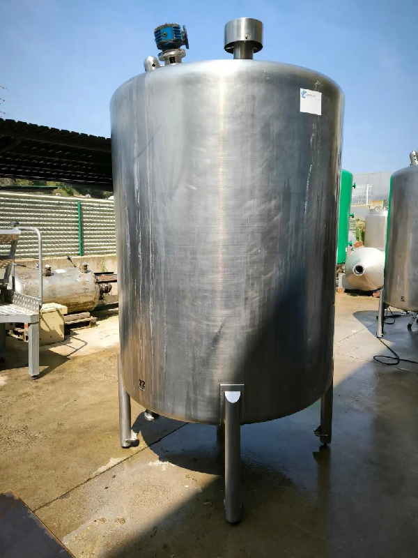 Cuve en acier inoxydable 316 d'une capacité totale de 12 000 litres. Fond supérieur Klopper avec agitation à hélice à différentes hauteurs. Fond inférieur Klopper avec décharge par le bas. Sur 4 pattes. - Référence : E7326