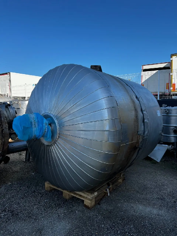 Cuve en acier inoxydable 304 d'une capacité de 4 900 litres. Fond inférieur Klopper avec décharge par le bas. Fond supérieur plat. Sur des affiches.