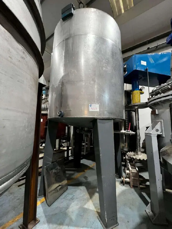 Cuve carrée en acier inoxydable d'une capacité de 1000 litres. Fond supérieur plat avec trou d'homme et agitation inclinée (type hélice tripale). - Fond inférieur plat incliné avec éjection par le bas. Équipement à 4 pieds posés sur une structure avec cellules de pesée. La structure per