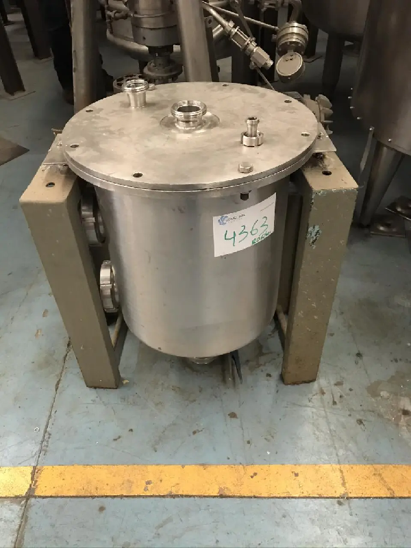 Cuve fabriquée par GIUSTI en acier inoxydable d'une capacité de 296 litres et d'un volume utile de 160 litres, fond supérieur incurvé vissé au corps avec 1 voyant et 3 raccords type clamp. - Fond inférieur conique avec évacuation par le fond et agitation. Sur 4 roues. Pressions de concepti