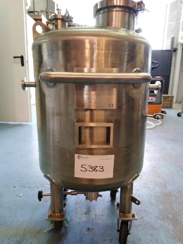 Cuve verticale en acier inoxydable d'une capacité de 150 litres. Fond supérieur convexe avec 6 raccords type clamp et 2 oreilles de levage.