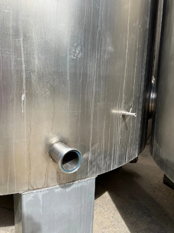 Cuve en acier inoxydable d'une capacité totale de 26 000 litres.Caractéristiques : - Fond supérieur conique avec agitation à hélice à différentes hauteurs. - Fond conique avec décharge par le bas. - Sur 5 pattes. -