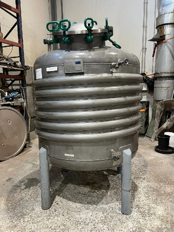 Cuve en acier inoxydable d'une demi - ronde et d'une capacité de 1000 litres.Fonds supérieur et inférieur : KlopperDécharge : par le basVolume - Capacité totale : 1000 LMatériel : Acier inoxydable 316/316LCaractéristiques techniques - Année de fabrication : 1985Pression de service du corps