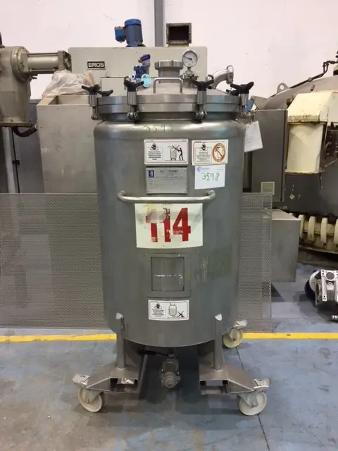 Cuve fabriquée par CREUSET Ets en 1998, d'une capacité de 350 litres et en inox. Matériel sur 4 roues et avec aménagements pour transport sur taureau ou transpalette. 3 buses et un manomètre en bas supérieur et une sortie en bas inférieur. Caractéristiques : Capacité : 350 litres Pression de service maximale : 3 bar Pression d'essai : 4,5 bar Dimensions : Diamètre du corps : 800 mm Hauteur du corps : 960 mm Hauteur totale : 1730 mm Douille torique : 140 mm x 80 mm Hauteur de sortie inférieure : 200 mm