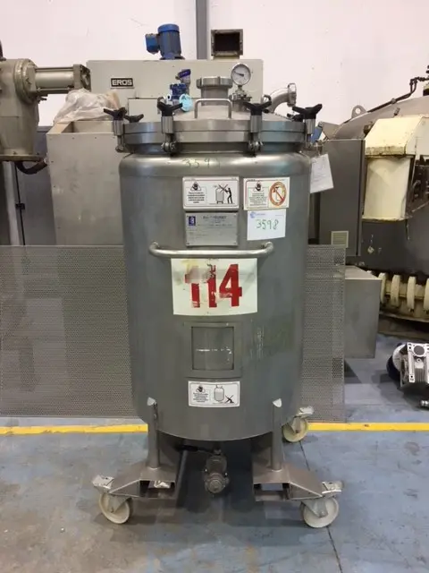 Cuve en acier inoxydable 316L, d'une capacité de 100 litres. Fond conique avec décharge par le bas. Sur roues. - Volume - Capacité totale: 100 L - Matériel - Acier inoxydable 316/316L - Matière chemise/demi - rond - Acier inoxydable 316/316L - Caractéristiques techniques - Fond inféri
