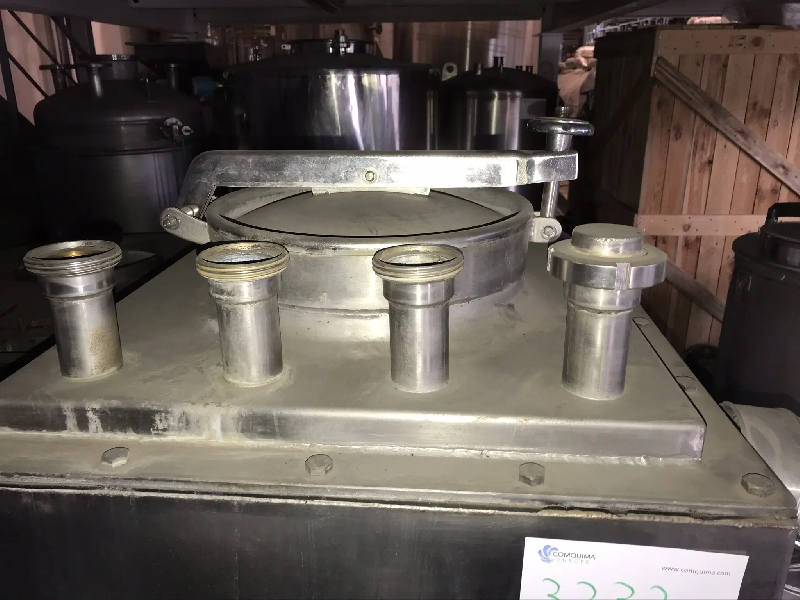 Cuve en acier inoxydable 316L, d'une capacité de 100 litres. Fond conique avec décharge par le bas. Sur roues. - Volume - Capacité totale: 100 L - Matériel - Acier inoxydable 316/316L - Matière chemise/demi - rond - Acier inoxydable 316/316L - Caractéristiques techniques - Fond inféri