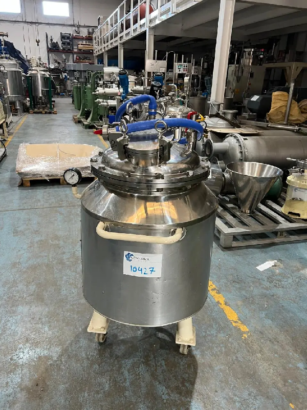 Cuve en acier inoxydable d'une capacité de 100 litres et double fond. Décharge par le bas. Sur roues.