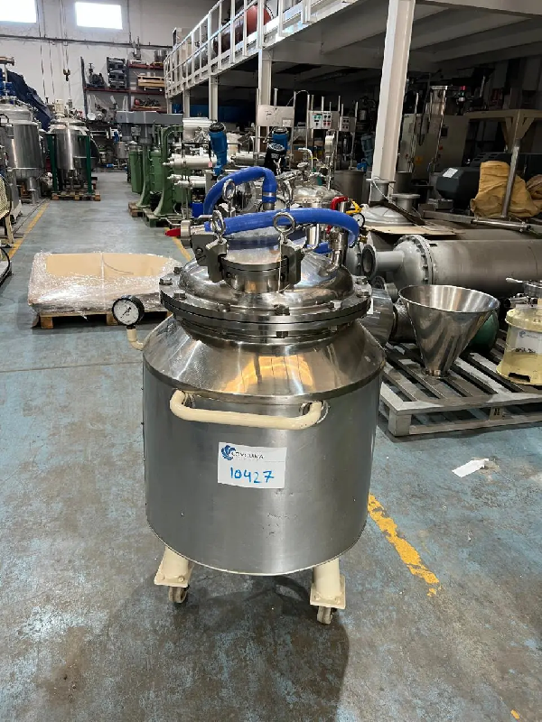 Cuve en acier inoxydable 316L, d'une capacité de 100 litres. Fond conique avec décharge par le bas. Sur roues. - Volume - Capacité totale: 100 L - Matériel - Acier inoxydable 316/316L - Matière chemise/demi - rond - Acier inoxydable 316/316L - Caractéristiques techniques - Fond inféri
