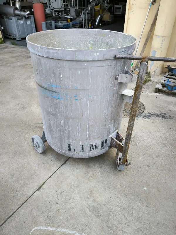 Réservoir d'occasion à utiliser avec Dispermix, d'une capacité de 340 litres. Sur roues. - Diamètre intérieur du corps : 700 mm - Volume : - Capacité totale : 340 L - Matériel : Fer - Dimensions : - Hauteur de la virole : 890 mm - Informations pour le transport : - Longueur : 1200 mm