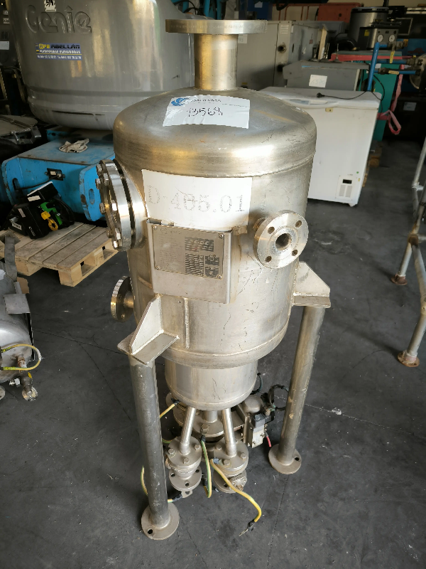 Cuve verticale de la marque TAINQ en acier inoxydable, d'un volume de 375 litres. Année 2003. - Fond Klopper avec sortie DN40 - Raccordements latéraux : - 2 brides DN25 - DN50 - Voyant DN100 - Fond supérieur Klopper avec brides DN25 et DN50. - Pression du corps : ATM - Température : 100