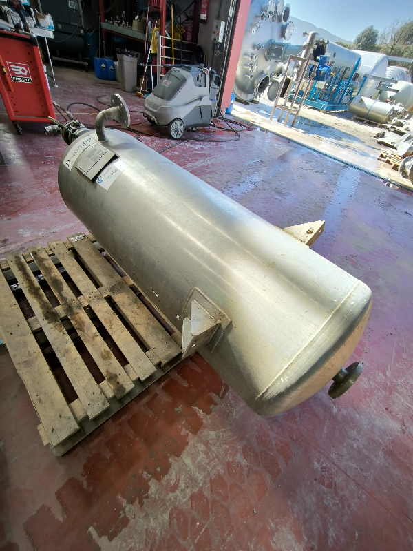 Réservoir en acier inoxydable 316, fabriqué par E.BACHILLER, d'une capacité de 100 litres. Année 1991. - Fond supérieur Klopper avec 2 raccords DN40 et voyant DN80. - Raccord latéral DN40. Avec deux niveaux visibles. - Fond Klopper avec sortie centrale DN40. - Avec deux supports. - Volume