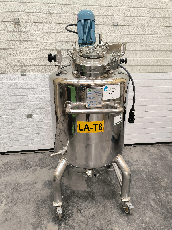 Réservoir vertical en acier inoxydable 316, d'un volume de 170 litres, avec agitation. - Fond supérieur plat avec couvercle. - Fond Klopper avec sortie de tube de 65 mm de diamètre. - Agitation de type hélice tripale. - Moteur : 0,37 kW à 1420 tr/min. - Sur 3 pieds. - Volume - Capacité