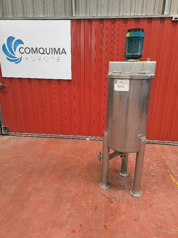 Réservoir vertical en acier inoxydable de marque LANDALUCE, calorifugé et avec agitation. Année de fabrication 1999. - Fond supérieur Klopper avec trou d'homme de 400 mm de diamètre. - Fond conique avec sortie centrale filetée NW65. Sorties latérales sur le fond avec filetage NW15 et NW50.