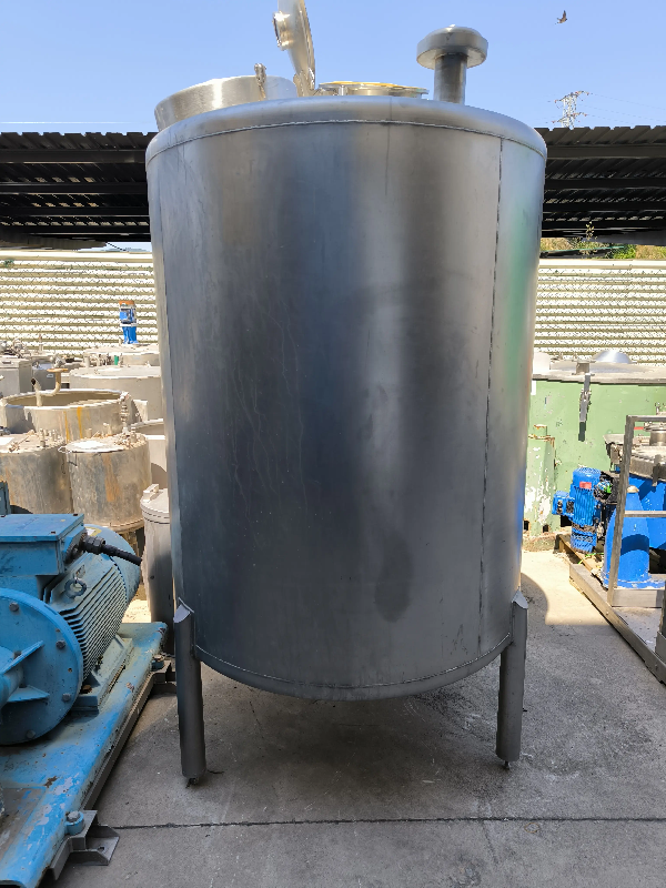 Réservoir vertical en acier inoxydable de marque LANDALUCE, calorifugé et avec agitation. Année de fabrication 1999. - Fond supérieur Klopper avec trou d'homme de 400 mm de diamètre. - Fond conique avec sortie centrale filetée NW65. Sorties latérales sur le fond avec filetage NW15 et NW50.