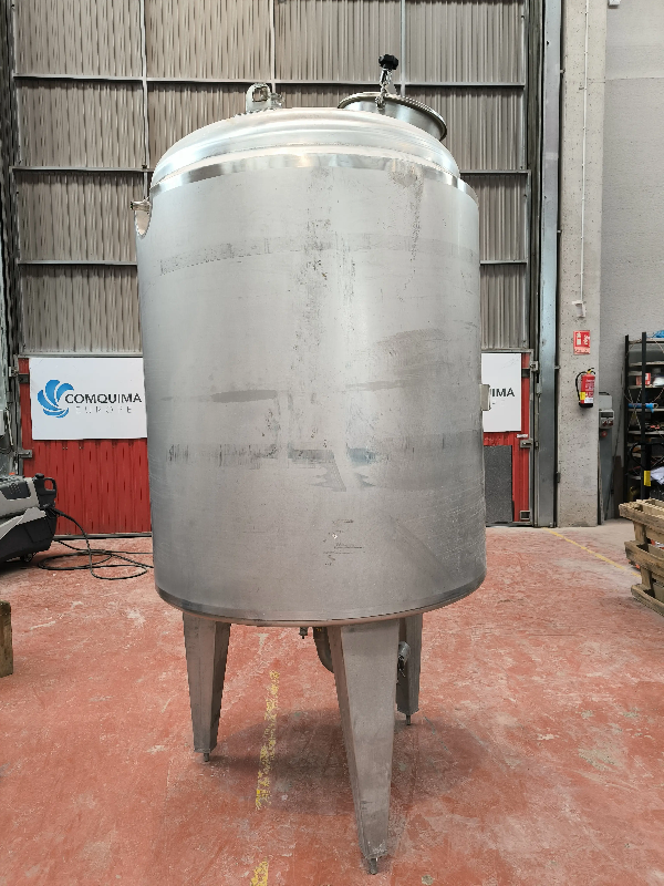 Réservoir vertical en acier inoxydable de marque LANDALUCE, calorifugé et avec agitation. Année de fabrication 1999. - Fond supérieur Klopper avec trou d'homme de 400 mm de diamètre. - Fond conique avec sortie centrale filetée NW65. Sorties latérales sur le fond avec filetage NW15 et NW50.