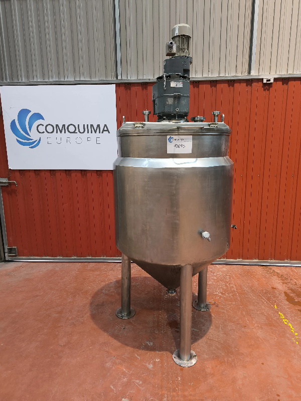 Réservoir vertical en acier inoxydable de marque LANDALUCE, calorifugé et avec agitation. Année de fabrication 1999. - Fond supérieur Klopper avec trou d'homme de 400 mm de diamètre. - Fond conique avec sortie centrale filetée NW65. Sorties latérales sur le fond avec filetage NW15 et NW50.