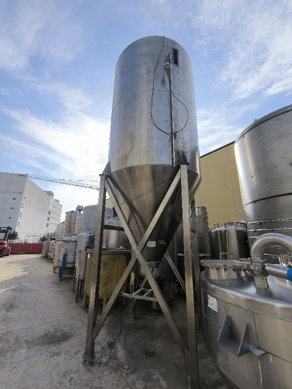 Cuve carrée en acier inoxydable de 1.000 litres.Structure sur 4 pieds.Fond supérieur plat avec trou d'homme de 400 mm de diamètre.Fond inférieur conique avec sortie de 340 mm de diamètre. - Dimensions du corps :Largeur : 940 mmLongueur : 940 mmHauteur du corps : 600 mmHauteur totale avec