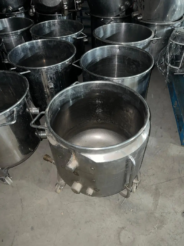 - Volume - Capacité totale : 130 L - Matériel - Acier inoxydable - Configuration de l'équipement - Double enveloppe - Sur roues - État - Dans son état -