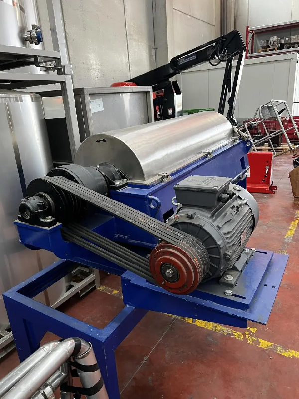 DÉCANTEUR MODÈLE NX 418 RÉNOVÉ. Plateforme en acier au carbone, avec fixations sur les 4 pieds pour ancrage au sol. Châssis en acier au carbone, fixé par Silent-Block à la plateforme. Support moteur latéral avec plaque de tension de courroie. Ancrage des paliers principaux. Bol en acier inoxydable de forme tronconique, en trois corps amovibles. Vis sans fin d'évacuation des solides en acier inoxydable de forme trocho-conique avec apport de tungstène dans l'avancée de la crête et de l'aile. Boîtier supérieur en acier inoxydable avec trois charnières arrière pour une ouverture facile, fermeture par vis. Tube d'alimentation en acier inoxydable. Réducteur de type cycle actionné par came. Moteur principal à une vitesse. Puissance de 18Kw à 3000 Rpm 400V / 50 Hz Roulements dûment surdimensionnés installés selon les normes du constructeur. Groupe roulant entraîné par 6 courroies trapézoïdales. Protège-sangle de protection intégré.