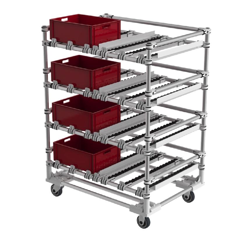 Chariot modulaire . Structure fermée anti-chutes sur 3 cotés avec stop bas en facade pour picking facile. Structure rails à galets FIFO . , Idéal pour cartons, boites et KLT. Niveaux réglables en hauteur. Charge 150 Kg par niveau. 4 Niveaux. Monté sur embase roulette platine : 2 Roulettes pivotantes et 2 roulettes pivotantes avec frein.