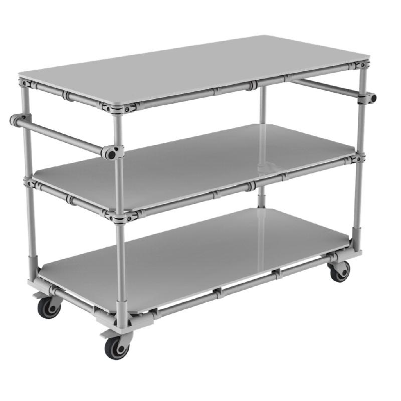 Desserte logistique usine multi - usage équipé de 3 niveaux réglables en hauteur. Poignée ergonomique réglable en hauteur. Structure Aluminium légère et maniable. 2 roulettes pivotantes fixes et 2 roulettes pivotantes avec frein montées sur platines - Référence : 47 - 3 - Marque : Trilog