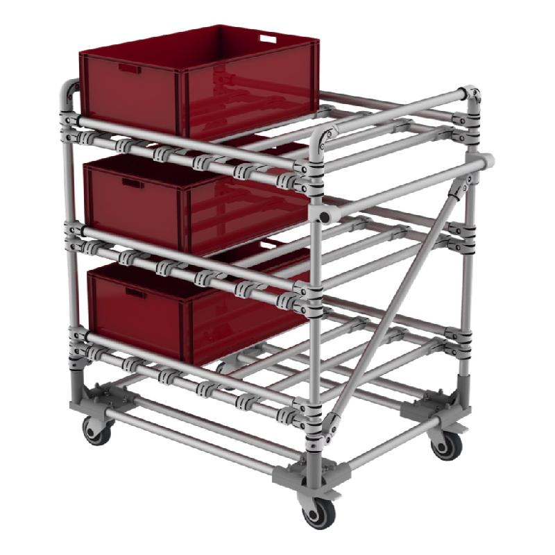 Chariot tubulaire de transport avec butées anti - chutes avant et arrière. Entièrement modulaire ajustable et évolutive. Ideal pour cartons, boites et KLT. 3 niveaux ajutables. Structure en Aluminium anodisée robuste. Montage sur embase platines roulettes avec 2 roulettes pivotantes et 2 roulet