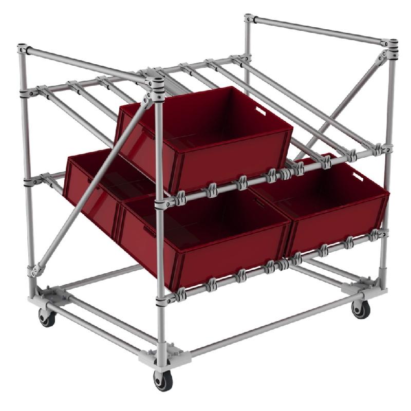 Chariot modulaire tubulaire. Structure fermée anti - chutes sur 3 cotés avec stop bas en facade pour picking facile. Idéal pour cartons, boites et KLT. Niveaux réglables en hauteur. Charge 150 Kg par niveau. 2 Niveaux. Monté sur embase roulette platine : 2 Roulettes pivotantes et 2 roulettes pi