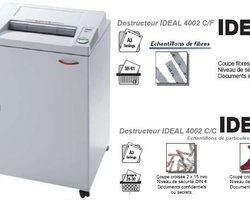 Les destructeurs de la gamme IDEAL 4002 sont des destructeurs de haut rendement et bénéficient d'un rapport prix/performances exceptionnel. Puissant moteur de 1300 Watts permet de détruire jusqu'à 41 feuilles de papier en un seul passage. + Grande ouverture de 400 mm. + Commande électronique multi-fonctions EASY_SWITCH avec guidage de l'utilisateur grâce à des codes couleurs et des symboles lumineux. Marche et arrêt par cellule, automatique. + Système de Protection et de Sécurité (SPS). + Cadre porte-sac (165 litres) sur glissières télescopiques. + Bloc de coupe en acier spécial, robuste et sûr, + Broyeur acceptant trombones et agrafes pour le modèle 4002 CF et le CC 4x40 mm. + Existe aussi en version coupe croisée. + Garantie de 30 ans sur les cylindres de coupe et 2 ans sur les autres pièces. + norme CE (norme de sécurité européenne) . 4X40 coupe croisée cap. 28 feuilles