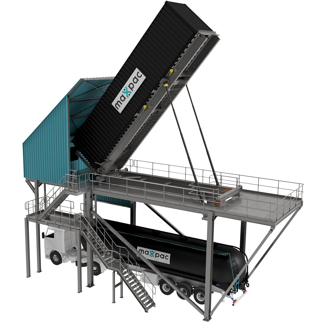 Basculeur de conteneur. - Idéal pour chargement vrac (ferrailles, plastiques, céréales, minerais, ...) pour export. - Existe en différentes versions (20', 40', version déchargement, version mobile, version transportable, pesée intégrée, moteur électrique, moteur thermique, ...) - Domaine