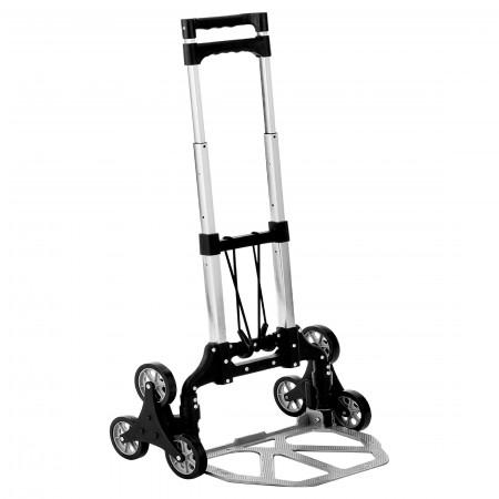 Diable monte escalier avec dispositif 3 roues en étoiles, en structure aluminium avec bavette rabattable.  Charge maximum de 70 kg pour un usage normal, et 30 kg maximum pour une montée d'escalier. Roues escamotables à bandage TPR sur jante plastique. Poignée de transport télescopique. Dimensions replié: (L x P x H) = 445 x 100 x 470 mm.