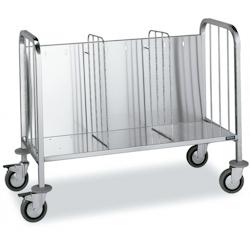 Chariot Inox Simple de Rangement et Transport d'Assiettes | Chariot de rangement et transport d'assiettesConstruction en acier inoxydable AISI 304 18/10.Structure très robuste et entièrement soudée.Étagères inclinées vers l'intérieur pour éviter la chute des assiettes.4 roulettes avec pare-chocs, de 125 mm de Ø, dont 2 avec frein.Le modèle double permet d'empiler d'un côté des assiettes allant jusqu'à 32 cm de Ø et de l'autre celles de 26 cm de Ø.Séparateur à tige non inclus.Livré monté.Dimensions modèle simple 1165 x 570 x 850 mm, capacité pour 150 plaques.