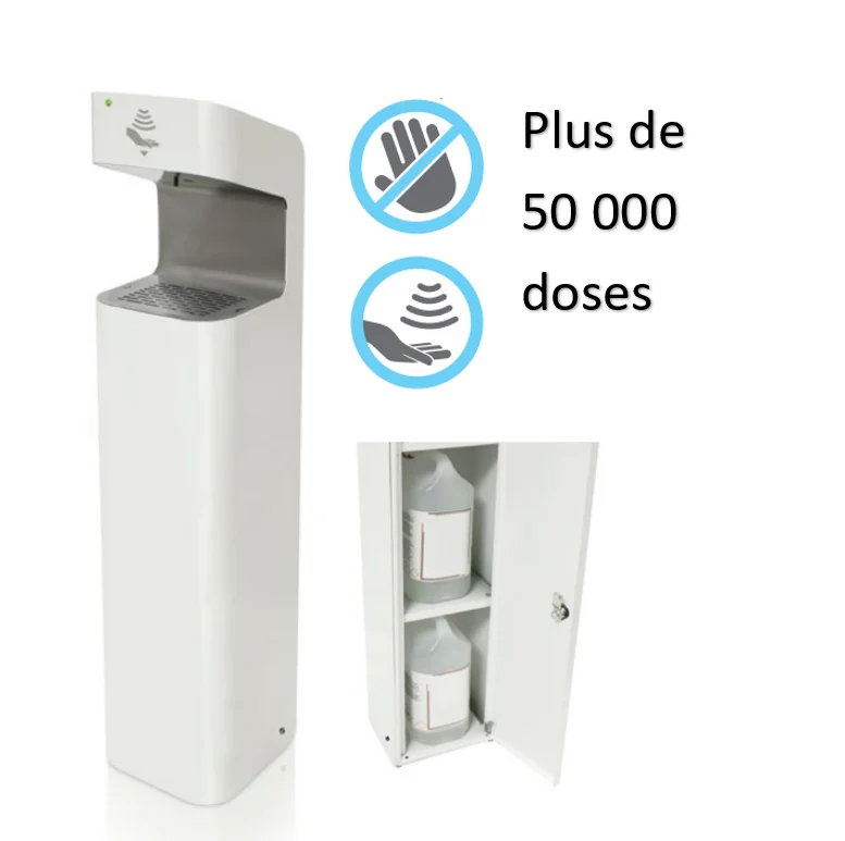Station de désinfection des mains automatique, permettant de se laver les mains sans contact avec le distributeur. La solution idéal dans les lieux accueillant du public, comme les écoles, les hôpitaux, commerces et entreprises. Détection infrarouge évitant le contact des mains sur le distribu