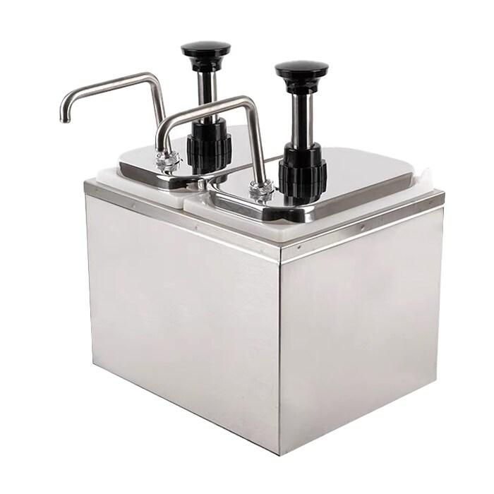Distributeur de sauce professionnel d'une capacité de 2 litres, équipé d'une pompe doseuse pour un service rapide et précis. Idéal pour buffets, restaurants et cuisines collectives. structure robuste avec support en inox pour une utilisation stable et hygiénique. Facile à remplir et à nettoy