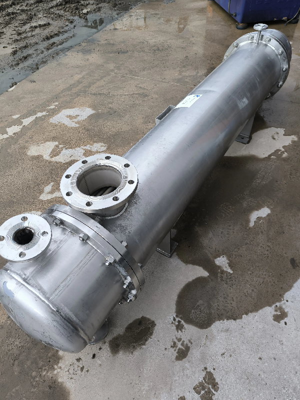Échangeur de chaleur tubulaire en acier inoxydable de la marque CYMIQ, 1,2 m². - Année : 2001. - Raccords : - Supérieur et inférieur : DN40 - Latéraux : DN25 et DN80 - Monté sur 2 consoles de support - Matériel : - Acier inoxydable - Caractéristiques techniques : - Année de fabric