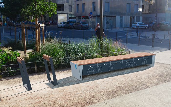 Banc de parc intégrant six caissons de rangement verrouillables Structure combinant l'acier et l'aluminium, lamelles en bois, caissons de rangement avec mécanisme de verrouillage cylindrique, chargeur USB, alimentation pour vélos électriques. Matériaux : - EBQ110 - 01b - bois de pin - EBQ110