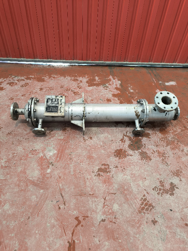 Échangeur de chaleur tubulaire en acier inoxydable de la marque Mointer, 11,5 m2 - Année : 2002 - Raccords : DN40, DN50, DN125 - Matériel : - Acier inoxydable - Caractéristiques techniques : - Année de fabrication : 2002 - Passages dans les Tubes : 1 - Nombre de Tubes : 47 - Dimensions
