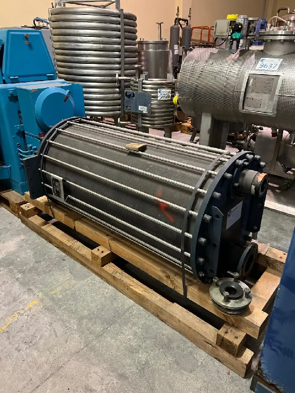 Échangeur de chaleur tubulaire en acier inoxydable de la marque Aguilar y Salas, 6,5 m². - Année : 1982 - Raccords : - Supérieurs : DN15, DN40 - Inférieur : DN40 - Extrémités : DN40 - Matériel : Acier inoxydable - Caractéristiques techniques : - Année de fabrication : 1982 - Volum