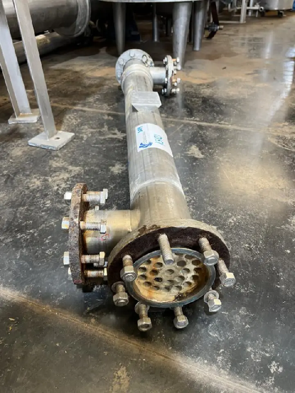 Échangeur de chaleur tubulaire en acier inoxydable de la marque TALLERES INOX VALLES avec une surface d'échange de 11 m². - Année : 2005 - Raccordements : - Latéraux : DN65 - Supérieur : DN25 - Inférieur : DN100, DN40 - Matériel : - Acier inoxydable - Caractéristiques techniques :