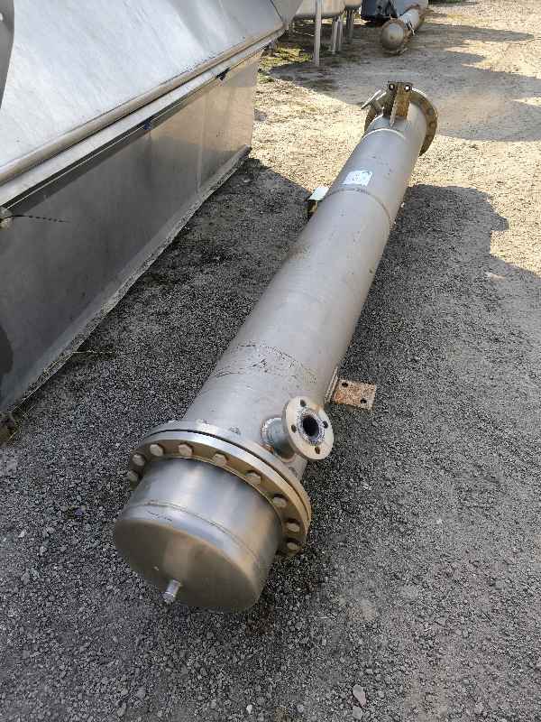 Echangeur de chaleur tubulaire d'occasion en inox, d'une surface d'échange de 10 m2. Nouveau matériau de joint : Klinger de 3 mm d'épaisseur - Référence : C13369