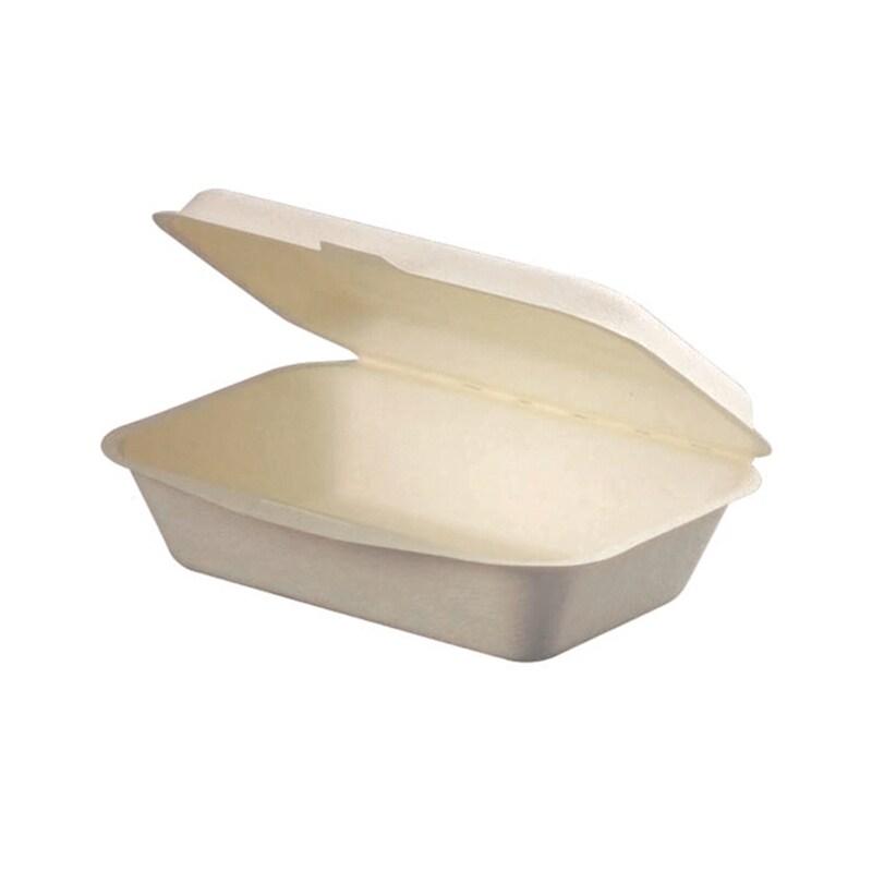 Lot de 50 boîtes repas de 193×135×50 mm avec couvercle, en pulpe végétale résistante et adaptée au contact alimentaire. Parfaites pour la vente à emporter, elles assurent une conservation sûre et pratique de vos plats tout en offrant une solution écologique et durable. - Marque : Ecolomiq