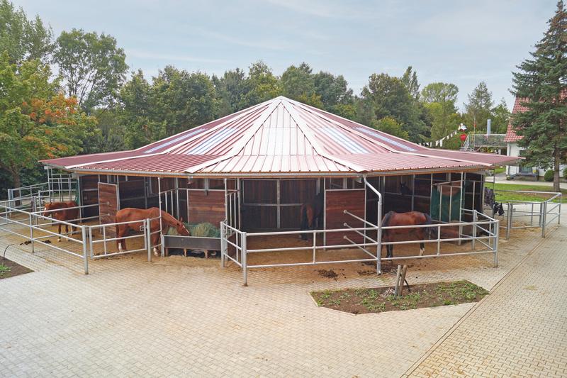 Une construction en acier avec 12 côtés, utilisée pour un rond de longe couvert ou un marcheur, constitue la base. L’enveloppe extérieure avec toit et murs est réalisée selon les souhaits du client et elle est adaptée au concept général de la cour. La combinaison pour la planification de l’écurie circulaire dépend des conditions et des besoins locaux.