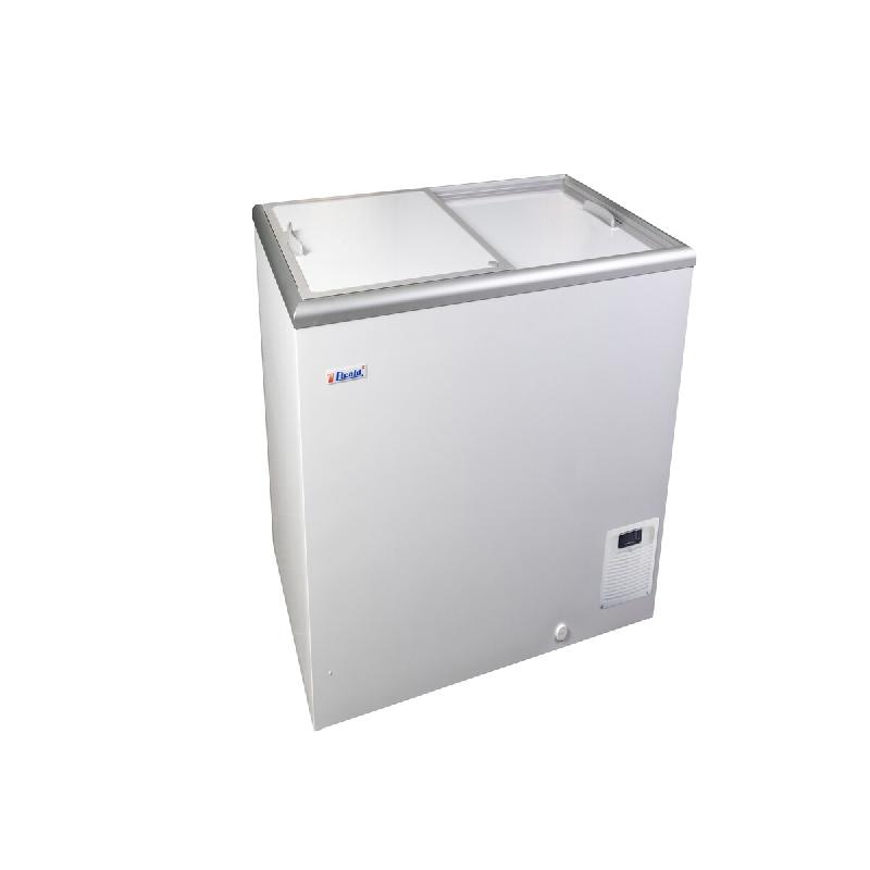 Couvercle coulissant plat vitré, monté sur roulettes pour un usage facilité. Modèle convertible de froid négatif à froid positif. Affichage digital, thermostat mécanique. Évaporateur et condenseur sur toutes les faces de l'appareil pour une bonne distribution du froid. Bonde de dégivrage av