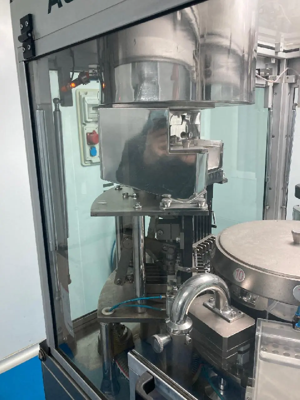 Encapsulateur fabriqué par ACG PAM PHARMA, modèle AF90T, avec plaque CE. Il prend en charge les formats zéro, double zéro et triple zéro, avec une capacité d'environ 90 000 capsules/heure. L'équipement comprend :