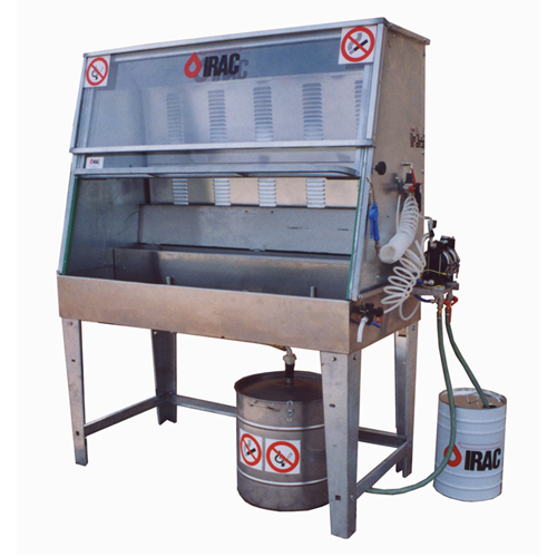 Caractéristiques - NETTOYAGE MANUEL - Poste individuel de nettoyage - Nettoyage avec des solvants écologiques ou inflammables - Fonctionnement Pneumatique - Une brosse autoalimentée et actionnée par la pompe pneumatique - Structure 100% en acier inoxydable - Solvant de nettoyage utilisé
