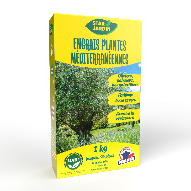 - Cet engrais assure un bon développement de vos oliviers et une floraison intense de vos plantes méditerranéennes (lauriers, lavande, bougainvilliers, etc.).