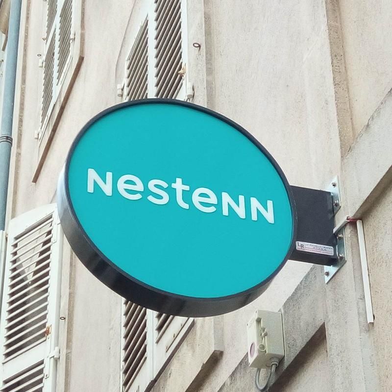 Enseigne drapeau ronde avec partie basse rectangulaire lumineuse à Led et Plexiglas diffusant pour la devanture de votre commerce. - Rendez votre commerce visible même le soir ou la nuit, avec une enseigne drapeau ronde avec la partie basse rectangulaire, lumineuse avec LEDs et Plexiglas diffusan