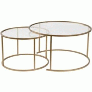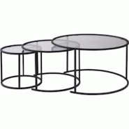 .Aspect : Matériau principal = Verre trempé • Matériaux secondaires = Métal • Dimensions : Diamètre (en cm) = 80 • Hauteur (en cm) = 43 • Autres caractéristiques : Informations complémentaires = Epaisseur du verre : 4 mm Dimensions petite table (D x H) : 60 x 39 cm Dimensions grande table (D x H) : 80 x 43 cm • Livré en kit = Oui • Poids (en kg) = 14,90 • Ensemble de 2 tables gigognes rondes en métal et verre Auruma
