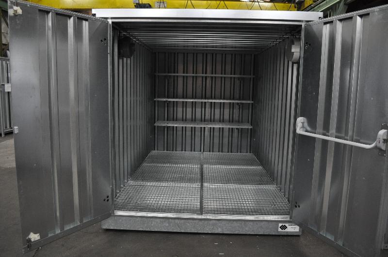Ce conteneur de stockage est un bungalow en acier galvanisé avec rétention intégrée. Il est parfaitement adapté pour contenir les produits dangereux. - Il s'utilise pour entreposer en toute sécurité des bidons, fûts et pots de différentes dimensions, contenant des produits chimiques, DMS,